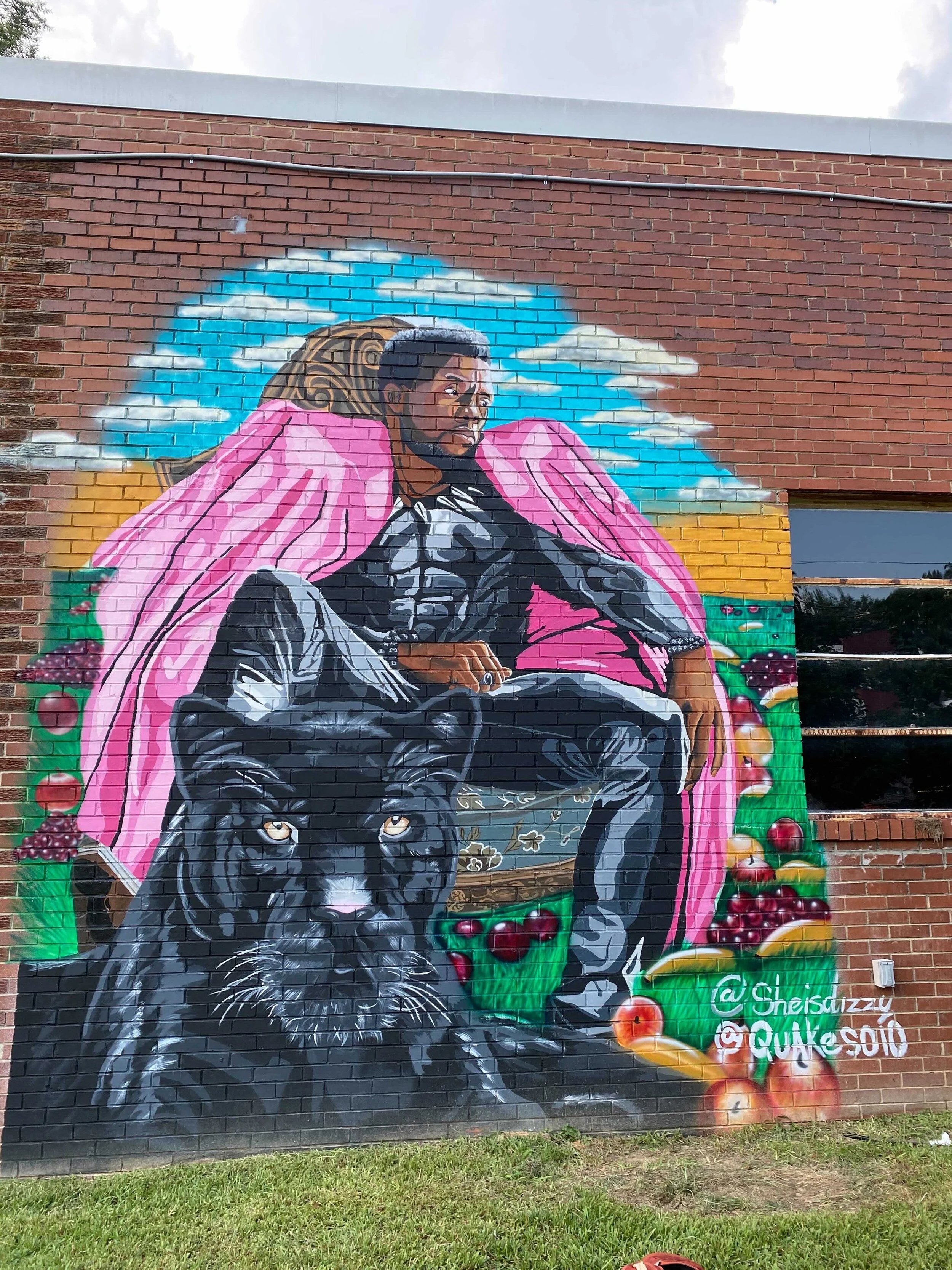Black Panther was Chadwick Boseman’s crowning glory as he lost his life to colon cancer on August 28, 2020. Approaching the anniversary of his death, artists Quake and Dizzy painted this mural to commemorate Boseman's legacy with a visual representation of his creative gifts to us all. The pink cape is an homage to his role as James Brown in Get On Up and the painted landscape of fruit to showcase the many fruits of his labor.